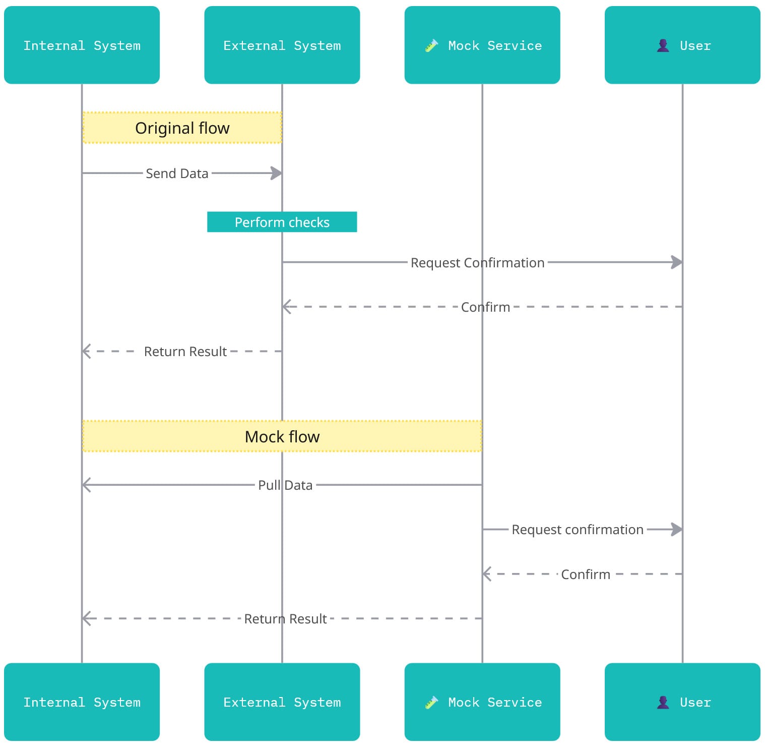 The external system expected our internal system to push data into it, and then it would push the results back. In the mock version, we changed only the first part of this flow. Instead of the internal system pushing data out, the mock service now pulls the records that are waiting for an external check directly from our existing API. The response flow remains the same: the mock still pushes the results back to the internal system, just like the external system would.